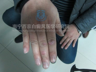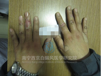 1、手指脱色严重,面积较大,先采用美国第二代308nm准分子激光治疗体系。治疗1个疗程,白斑四周黑色素沉着明显,白斑面积缩小。