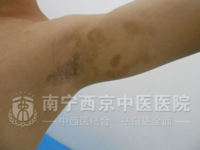 ▲现病史:腋下、颈部患有白斑,边缘模糊不清,曾在地方诊所使用药物治疗,具体药物不详,治疗无效果。近来病情加重,故来我院就诊。